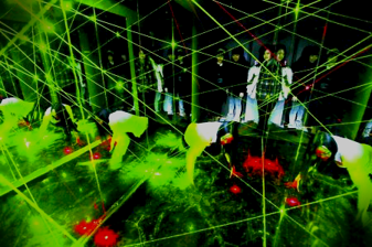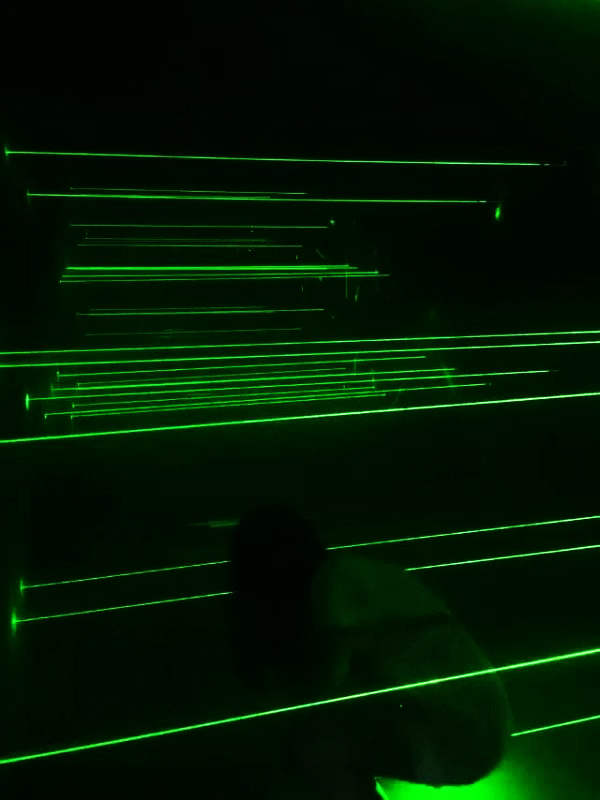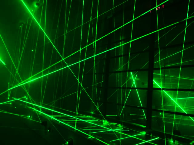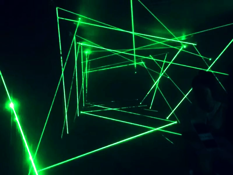 激光密室逃脫,使用特殊激光裝置,通過電子電路控制的一系列鐳射發(fā)射器和接收器,組成鐳射光網(wǎng)。